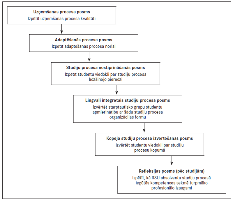 No 2014. gada septembra līdz 2015. gada martam RSU tika pētīts ārvalstu studentu mācību process, lai iegūtu datus un formulētu argumentus studiju procesa pilnveidei, kas veicinātu studējošo augstas profesionalitātes attīstīšanu un augstskolas prestiža un starptautiskā zīmola nostiprināšanu. Lai veiktu visaptverošu pētījumu, tika identificēti izpētes posmi, kas atspoguļo studiju procesu no imatrikulācijas līdz pat augstskolas absolvēšanai (sk. 1. att.). Konteksta datus veido informācija, kas iegūta, izzinot rekrutēšanas un uzņemšanas procesa posmu.