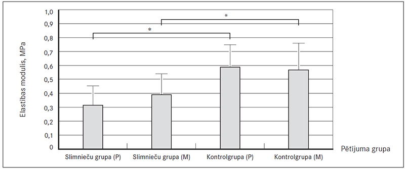 Slimnieču grupā elastības modulis priekšējā sienā ir 0,321 ± 0,131 MPa, kas ir būtiski mazāk nekā elastības modulis taisnās zarnas priekšējā sienā kontrolgrupā 0,596 ± 0,161 MPa (p < 0,037). Elastības modulis mugurējā sienā slimnieču grupā 0,397 ± 0,152 MPa tāpat ir mazāks nekā elastības modulis taisnās zarnas mugurējā sienā kontrolgrupā 0,57 ± 0,191 MPa (p < 0,042). Rezultātā mēs konstatējām, ka cilvēka taisnās zarnas siena patoloģijas gadījumā kļūst plānāka, mazāk stinga un padevīgāka, salīdzinot ar taisnās zarnas sienu bez patoloģijas. Šādu izmaiņu cēloni vajadzētu izvērtēt saistībā ar patoloģiski izmainītās zarnas sienas strukturālām izmaiņām. Tādēļ ir jāveic arī tālāka taisnās zarnas sieniņas morfoloģiska analīze un jāsalīdzina rezultāti gan slimnieču, gan kontroles grupā.