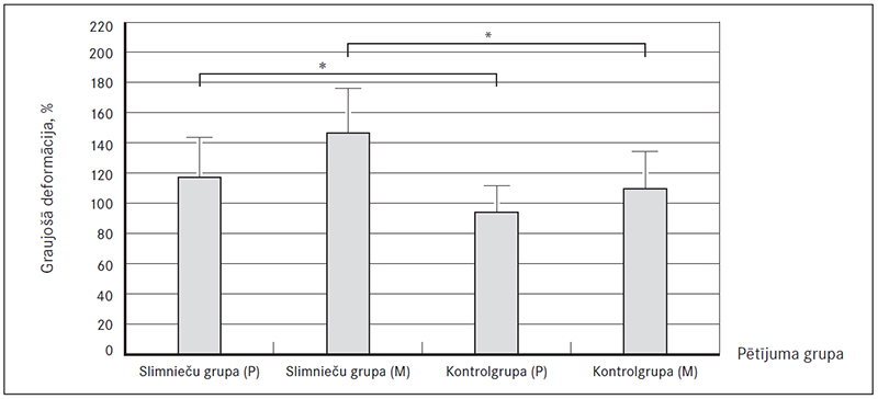 Slimnieču grupā taisnās zarnas sienas graujošā deformācija statistiski ticami ir lielāka nekā kontrolgrupā (p < 0,05). Tā, piemēram, ε*p slimnieču grupā statistiski ticami ir lielāks nekā ε*p kontrolgrupā (p < 0,047). Graujošā deformācija taisnās zarnas mugurējā sienā ε*m slimnieču grupā ir lielāka nekā kontrolgrupā (p < 0,008).