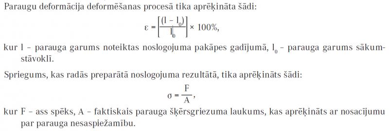 Vienass noslogojuma stendā iegūtie dati tika apstrādāti ar testXpert programmatūru un noteikts paraugu graujošais spriegums, graujošā deformācija, kā arī pieskares elastības modulis to spriegumadeformācijas līknes lineārajā daļā. Datorprogramma mērījumu rezultātus atspoguļoja kā tabulu un grafiski kā sprieguma-deformācijas līkni, uz koordinātu ass attēlojot deformācijas izmaiņas (%), bet uz ordinātu ass – sprieguma izmaiņas (MPa).