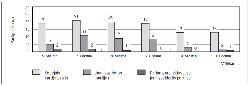 Savukārt, neskaitot Tautas kustību “Latvijai”, 6. Saeimas vēlēšanās pilnīgi no jauna radušos partiju skaits bija neliels – kopā tikai 5 (sk. 1. att.), bet viena no tām kļuva par otro spēcīgāko parlamentāro partiju. Lielākoties partijas bija mainījušas savu veidolu, piemēram, daļa partiju bija apvienojušās (LNNK un Latvijas Zaļā partija), daļa bija mainījušas savus nosaukumus (no “Saskaņa Latvijai, atdzimšana tautsaimniecībai” uz “Tautas saskaņas partija”), kas saistāms ar “Saskaņa Latvijai, atdzimšana tautsaimniecībai” sadalīšanos neilgi pēc ievēlēšanas parlamentā.