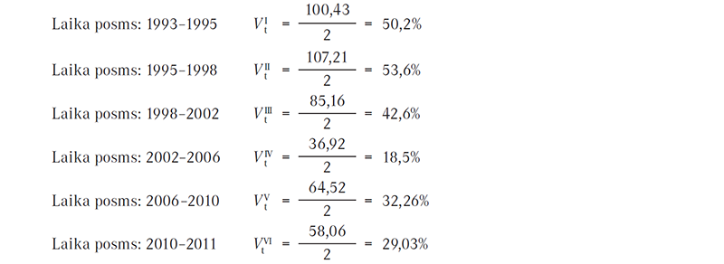 Šajā formulā Vt ir skaitliskā vēlētāju nepastāvība vai mainīgums (net volatility) divu vēlēšanu griezumā visām partijām, kas piedalījušās vēlēšanās. Latvijas gadījumā būs iespējams iegūt sešus Vt rezultātus, jo kopš 1991. gada valstī ir notikušas septiņas parlamenta vēlēšanas. Formulā īpaša nozīme ir diviem mainīgajiem, kas apzīmē politisko partiju iegūto procentuālo vēlētāju atbalstu divās vēlēšanās pēc kārtas (pi,t apzīmē partijas “i” iegūto kopējo vēlētāju atbalstu procentos vēlēšanās “t”, bet pi,t−1 apzīmē partijas “i” iegūto vēlētāju kopējo atbalstu procentos attiecīgi vēlēšanās “t−1”, tātad iepriekšējās vēlēšanās. Summas zīme formulā norāda, ka aprēķini tiek veikti par pilnīgi visām konkrētajās vēlēšanās startējušajām politiskajām partijām. Formulā uz visu vēlēšanās piedalījušos partiju skaitu savukārt norāda “n”. Divās vēlēšanās pēc kārtas iegūtā vēlētāju procentuālā atbalsta no visa nobalsojušā elektorāta starpība (Δ pi,t = pi,t − pi,t−1) ir ietverta modulī, kas nozīmē, ka iegūtā vērtība jebkurā gadījumā būs pozitīva (nenegatīva), lai arī, protams, vēlēšanās ir iespējama situācija, kad nākamajās vēlēšanās partija iegūst mazāku vēlētāju atbalstu nekā iepriekšējās vēlēšanās, kas šajā formulā bez moduļa dotu negatīvu vērtību. Summas zīme (kopējās tīrās izmaiņas (Total Net Change), kas iekavās atrodas pirms moduļa, nozīmē, ka izteiksme attiecas nevis tikai uz vienu politisko partiju, bet visām partijām, kas piedalījušās abās attiecīgās valsts konkrētajās vēlēšanās [13].