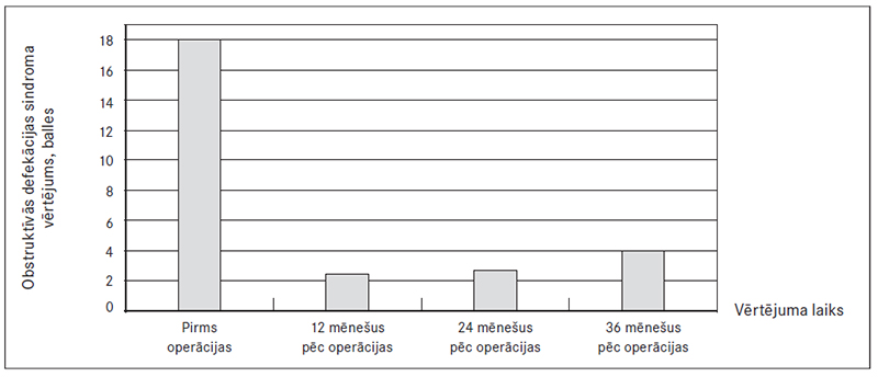 Atsevišķi izdalot pacientus ar papildu atradi defekogrāfijā – enterocēle un m. puborectalis sindroms –, pēcoperācijas ilgtermiņa rezultāti 36 mēnešus pēc operācijas arī bija pārliecinoši labi un stabili.
